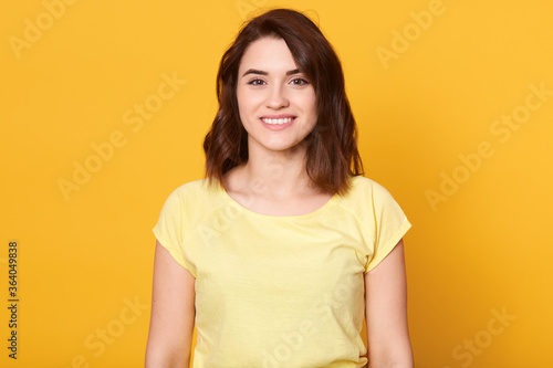 Happy smiling brunette female with pleasant appearance wearing casual clothing looking directly at camera, posing isolated over yellow background, looks satisfied.