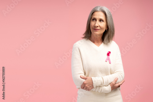 Happy, smiling cheerful senior woman wearing white sweater with pink ribbon posing with crossed arms
