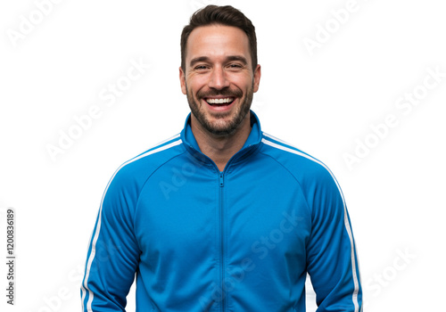 Happy Smiling Man Blue Tracksuit Jacket Portrait Studio Male Gear Model Person Joyful Active Sports