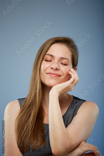 Happy smiling woman dreaming with eyes closed. isolated portrait.