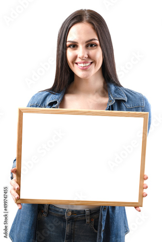 Happy smiling woman holding a placard on a white background in the studio. A beautiful girl shows an advertisement