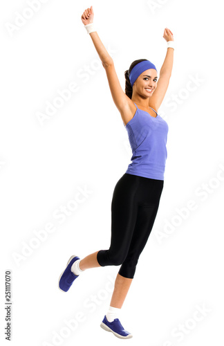 happy smiling woman jumping or doing fitness aerobics exercise, isolated