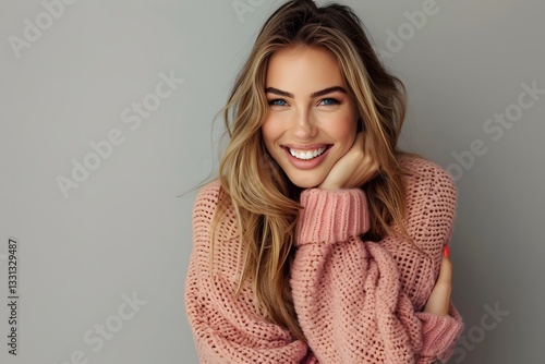 Happy Smiling Woman Portrait in Pink Sweater - Beautiful Girl with Long Brown Hair and Perfect White Teeth