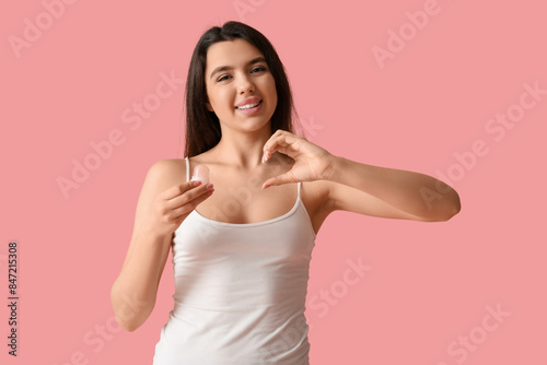 Happy smiling young woman holding crystal deodorant and making heart with her hand on pink background