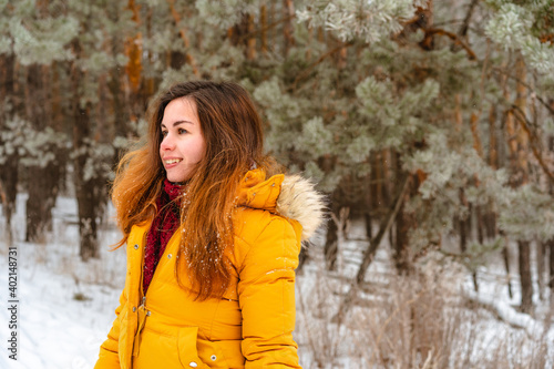 Happy smiling young woman in yellow jacket in snowy winter forest