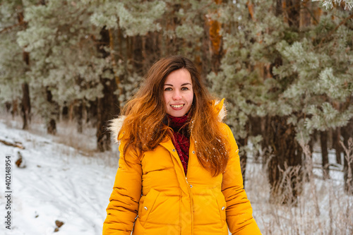 Happy smiling young woman in yellow jacket in snowy winter forest