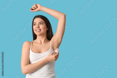 Happy smiling young woman using crystal deodorant on blue background