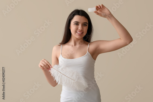Happy smiling young woman with crystal deodorant and feather on beige background