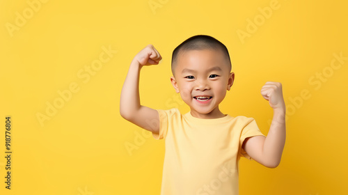 happy strong bald Asian child show hand muscle against yellow background , a copy space , childhood cancer day, Children day