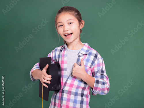Happy student girl holding graduation cap and showing thumb up.Isolated on green chalkboard background.