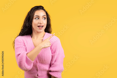 Happy surprised young caucasian brunette woman pointing finger at empty space