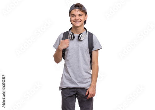 Happy teen boy in cap with headphones and backpack, isolated on white background. Cheerful child smiling and looking at camera. Emotional portrait of handsome teenager guy Back to school.