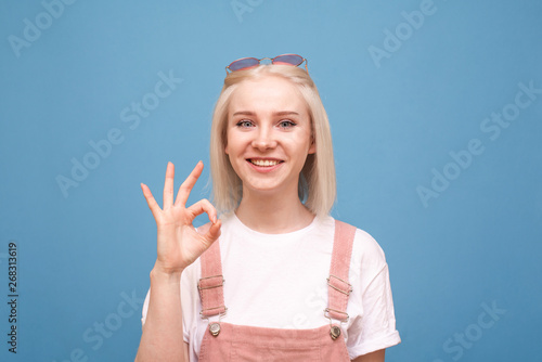 Happy teen girl shows a sign OK looks at the camera and smiles, wears a cute casual clothing and sunglasses, isolated on a blue background. Portrait of a happy teenager.