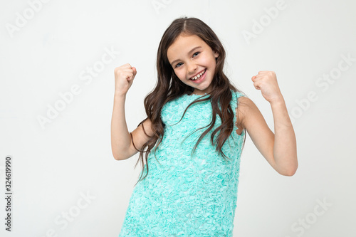 happy teenager girl in a blue dress rejoices winnings on a white studio background
