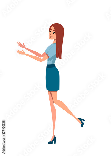 Happy thin woman in casual clothes with up raised arms hands pointing cartoon character design flat vector illustration isolated on white background