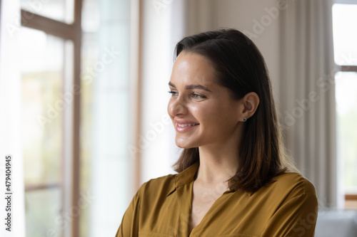 Happy thoughtful millennial business woman in casual looking at window with pensive dreamy smile, thinking of work project future vision, ambitious career, planning goals. Head shot portrait