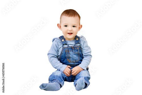 Happy toddler baby boy sitting in a children tent, playroom, isolated on a white background. Kid age one year