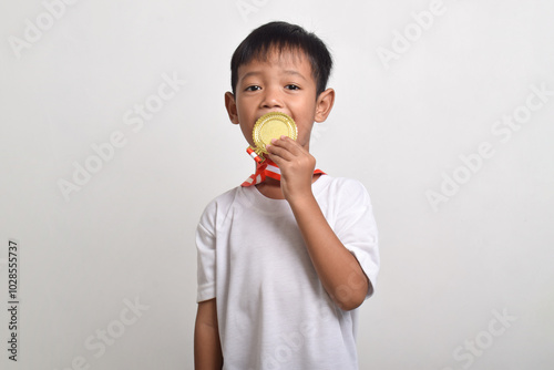 Happy winner. Little asian boy kissing the gold medal. Smiling child celebrating his success, isolated on a white background