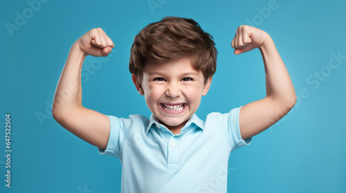 happy winner school boy isolated on blue background celebrates new success, power, energy. Yes !