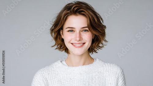 Happy Woman Smiling Portrait Studio Shot Casual White Sweater