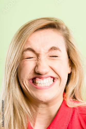 Happy woman, funny face and teeth with goofy expression for humor or comedy in studio on a green background. Closeup, female person or silly model with big smile and eyes closed for comic or fun joke
