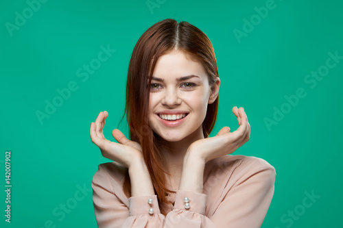 happy woman gestures with hands on a green background
