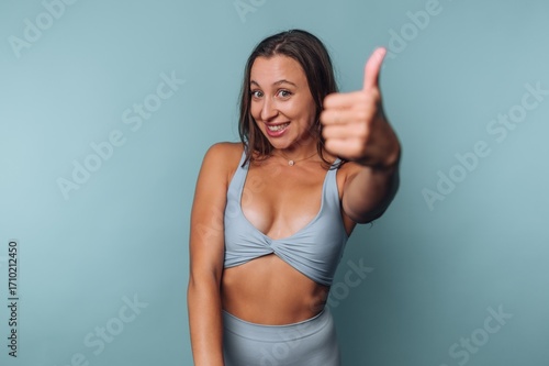 Happy woman giving a thumbs up while wearing a light blue fitness outfit against a solid background