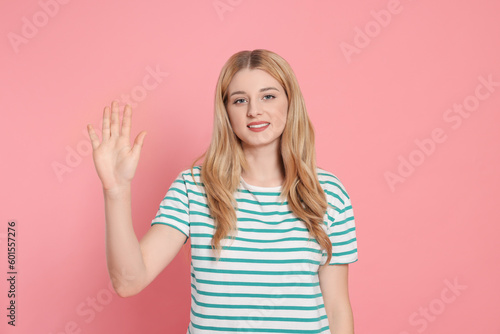 Happy woman giving high five on pink background