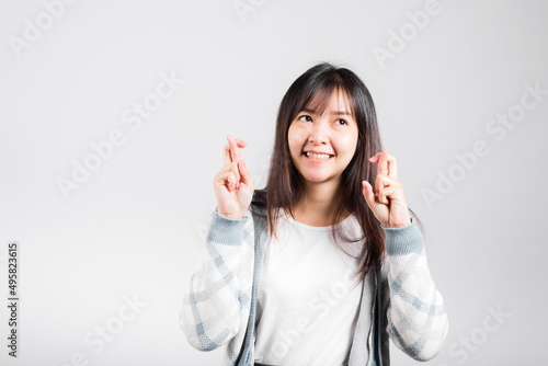 Happy woman have superstition her holding fingers crossed for good luck gesture, Asian beautiful young female smiling superstition, studio shot isolated on white background with copy space
