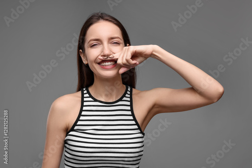Happy woman holding finger with drawn mustache above lips on grey background