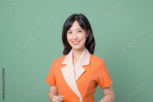 Happy woman in an orange outfit against a green background showing a friendly and positive expression