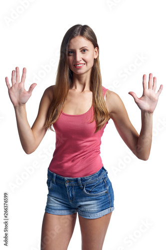 Happy woman in shorts showing nine fingers