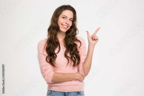 Happy woman pointing finger away