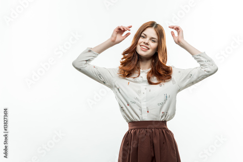 happy woman raised her hands up, light shirt and skirt