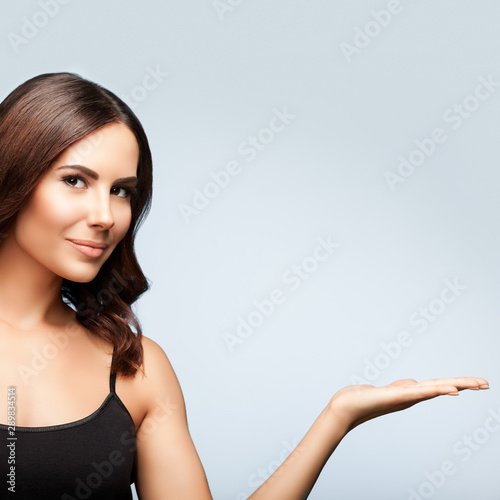 happy woman showing copyspace or something, isolated over bright grey color studio background