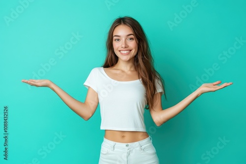 Happy woman showing open hands. Perfect for websites, blogs, and ads needing a friendly, welcoming presentation.