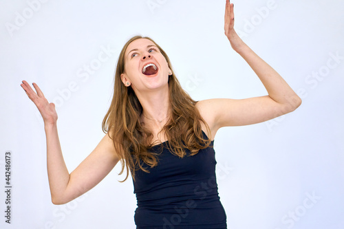 Happy woman smiles and laughs. Joyful emotion. A beautiful Caucasian woman stands on a white background in a blue sweater with loose hair. The woman shows emotions.