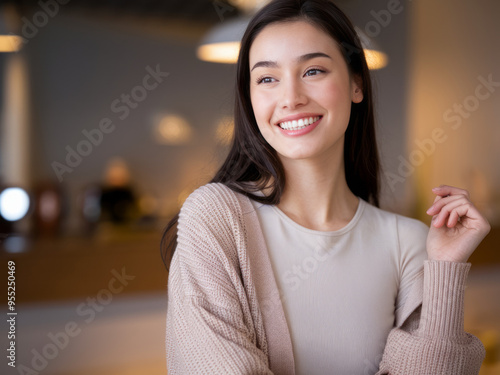 Happy woman smiling. A young woman with long hair, wearing a knitted cardigan, smiles cheerfully while looking away.