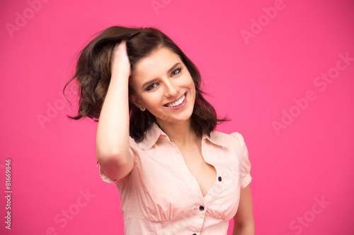Happy woman touching her hair and looking at camera