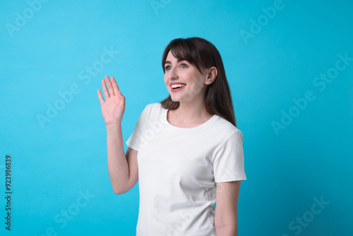 Happy woman waving on light blue background