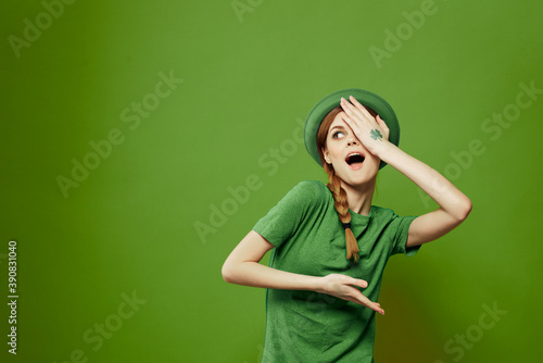 Happy woman with shamrock on St. Patrick's Day in green clothes and a hat on her head gesturing with her hands