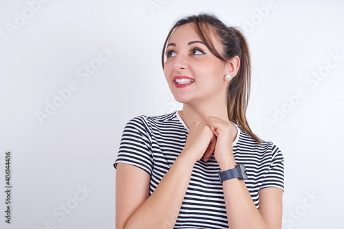 Happy young Arab woman wearing striped t-shirt over white background anticipates something awesome happen, looks happily aside, keeps hands together near face, has glad expression.