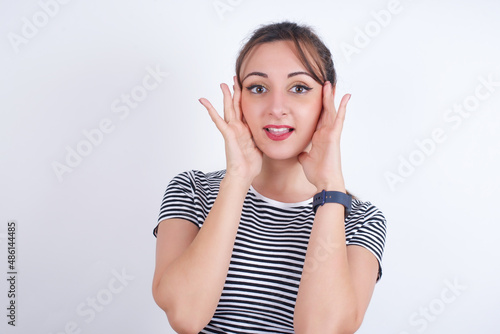 Happy young Arab woman wearing striped t-shirt over white background touches both cheeks gently, has tender smile, shows white teeth, gazes positively straightly at camera,