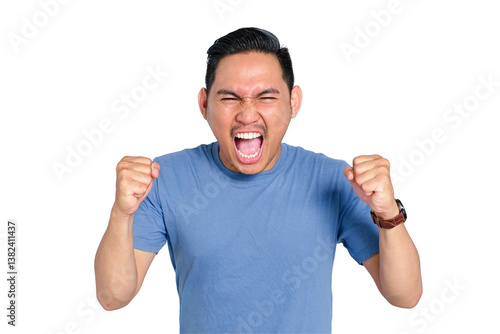Happy young Asian man celebrating success with clenched fists, smiling with excitement and joy, wearing blue t-shirt, isolated on transparent background