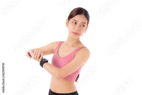 Happy young asian woman looking smartwatch for exercise and aerobics with cardio isolated on white background, female looking smart watch with wrist for pulse while workout with health, sport concept.