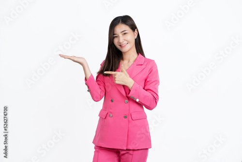 Happy young Asian woman presenting or showing open hand palm with copy space for product isolated on white background