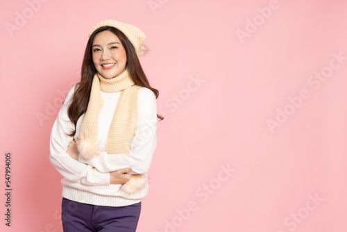 Happy young Asian woman traveler in sweater shirt smiling and looking at camera isolated on pink background, Happy feeling concept