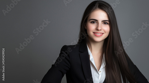 Happy young businesswoman smiling confidently in blazer, professional portrait. Success, ambition, and modern elegance in the workplace.