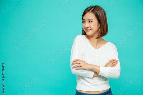 Happy young casual asian woman hugging herself isolated on green background. Love yourself concept