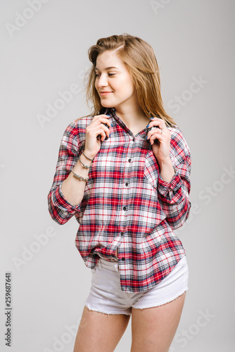 Happy young caucasian woman wearing shirt and shorts with headphones smiling and posing on the grey background